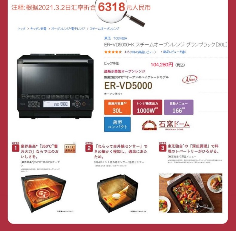 東芝(TOSHIBA)電子レンジ1つを入力し、家庭用周波数変換器で1合の空気を蒸して発酵ER-VD 5000 CNB 30 Lを揚げる。